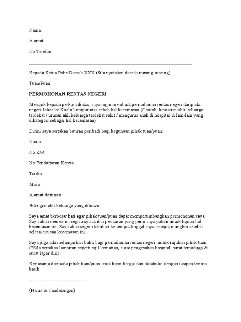 Contoh surat memohon kebenaran rentas negeri Contoh Surat Rasmi Permohonan Rentas Negeri
