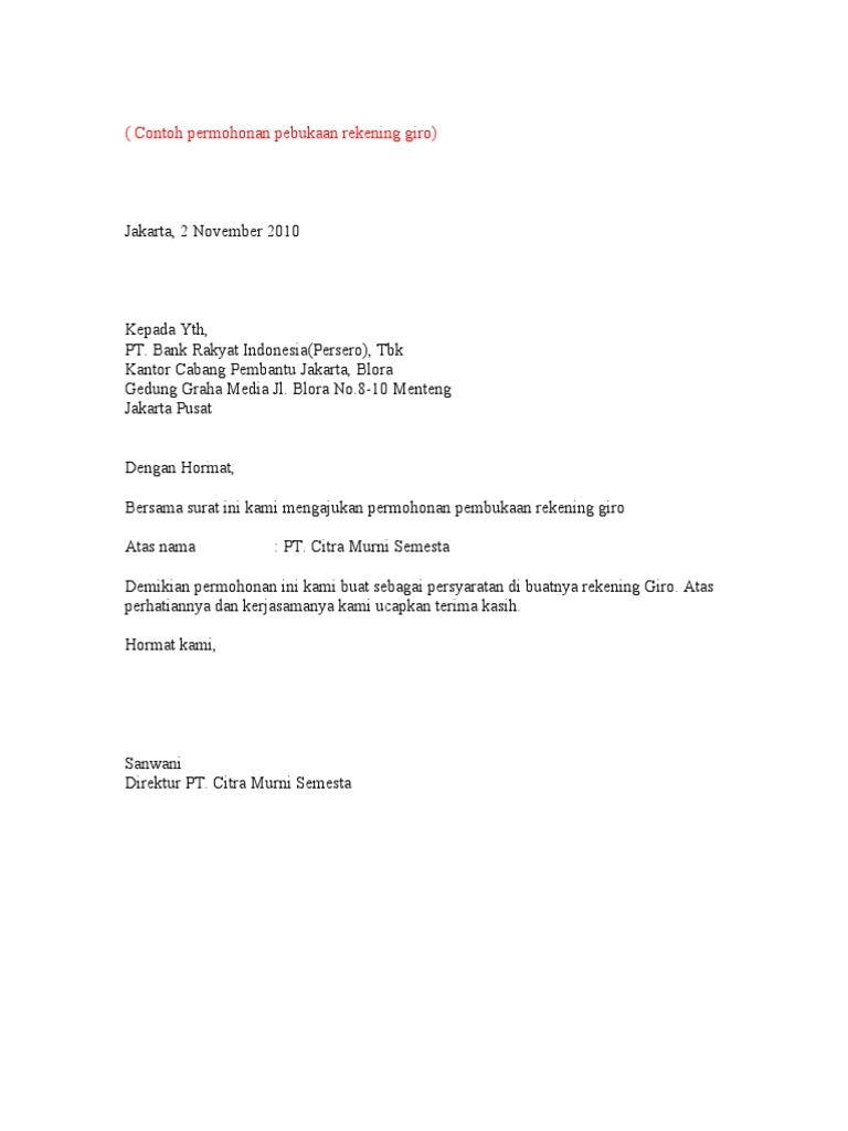 Contoh surat permohonan pembukaan rekening giro bank mandiri Contoh Surat Buka Giro